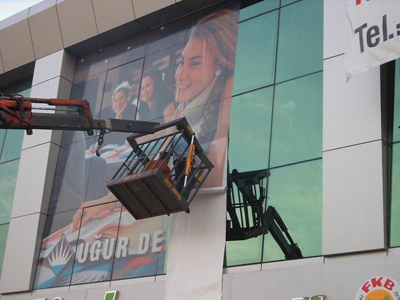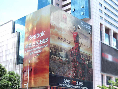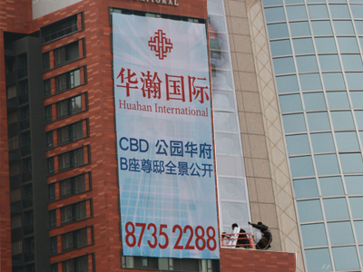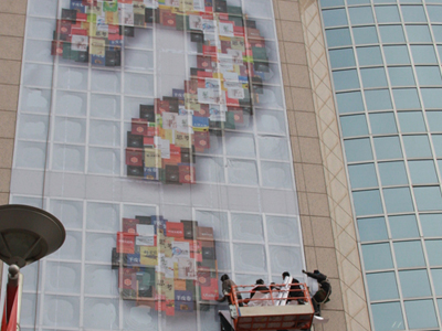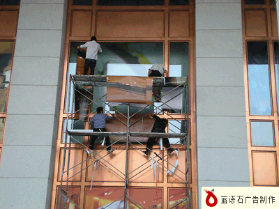 楼体广告一般采用单透贴和网格布材料,因为材料耐晒,防水,透光,还有一定的防爆功能。所以既保证了室内的正常采光,又确保画面的完整性。我们的施工过程中均采用韧性强,色彩还原好的材料,保证玻璃表面不会因为粘贴画面而残留污垢,同时保证画面的美观。