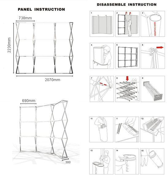 热转印布面,不怕水洗,折叠无痕迹。无拼接。布四周粘尼龙扣,与架体上尼龙扣相吸结合。携带轻便。总重约10KG。